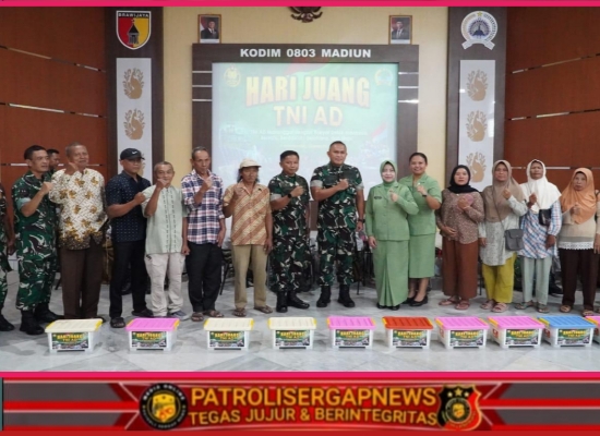 PATROLISERGAPNEWS.COM – Madiun – Dalam rangka memperingati Hari Juang TNI AD ke-80 dan HUT ke-77 Kodam V/Brawijaya, Korem 081/DSJ menyelenggarakan Bakti Kesehatan di Makodim 0803/Madiun, Jl. Pahlawan No. 25, Kota Madiun, Rabu (10/12/2025). Kegiatan yang dibuka untuk umum itu dilakukan dalam bentuk pengobatan gratis, donor darah, dan pembagian Bansos sebanyak 170 paket.